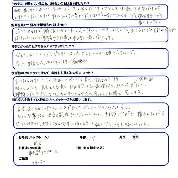 - スポーツでムキムキになった下半身のコンプレックスが解消した。