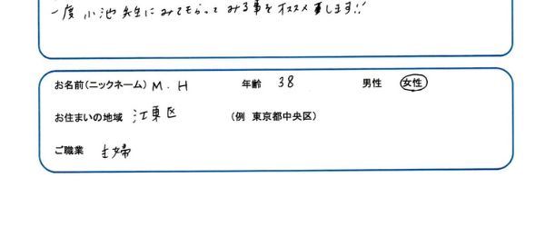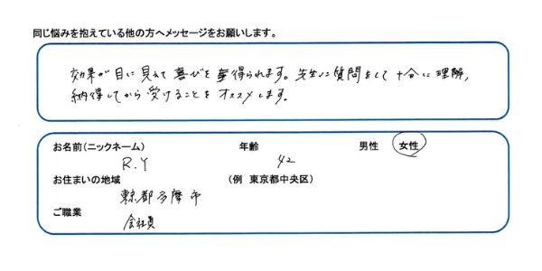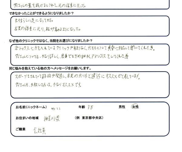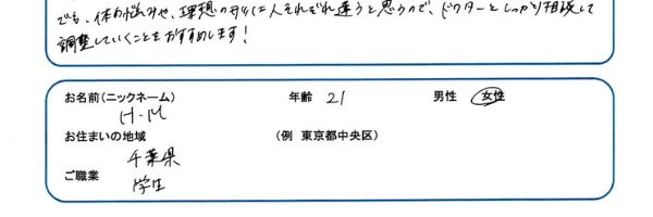 - 筋肉のはりがなくなり、鏡で見て明らかに前と違うのが分かるようになった。ひざ下を出した服を着るのに抵抗がなくなった。【A.I 23 女性 茨城県 公務員】
