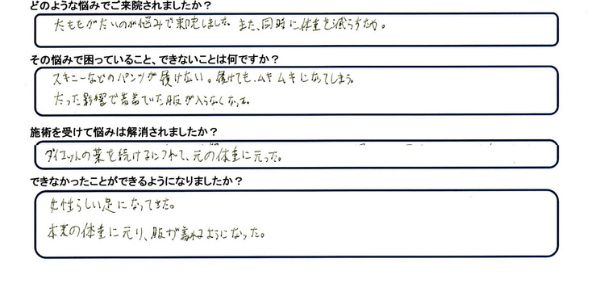 - 女性らしい足になってきた。本来の体重に戻り、服が着れるようになった。【ゆい 38歳 女性 神奈川県 会社員】