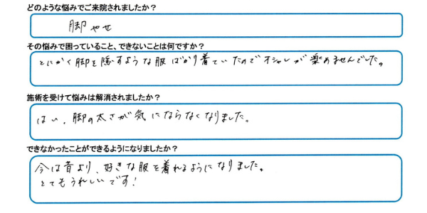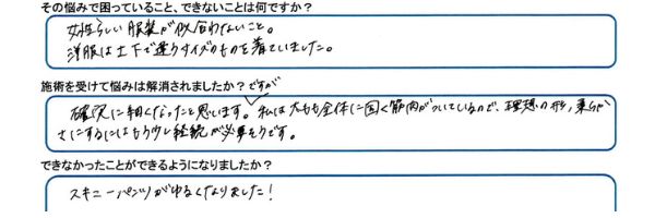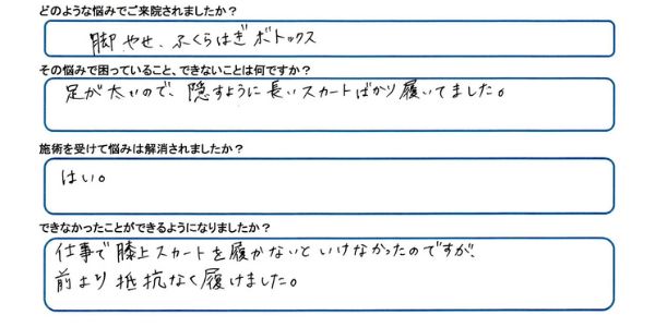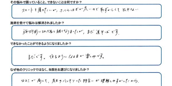 - 以前よりは細くなったかな、と思いますが、(心理的に)抵抗がまだあるので、100%解消されたというわけではないですが、ロングスカートくらいなら大丈夫かな?と思えるようになりました。【M.A 26 女性 千葉県船橋市 会社員】
