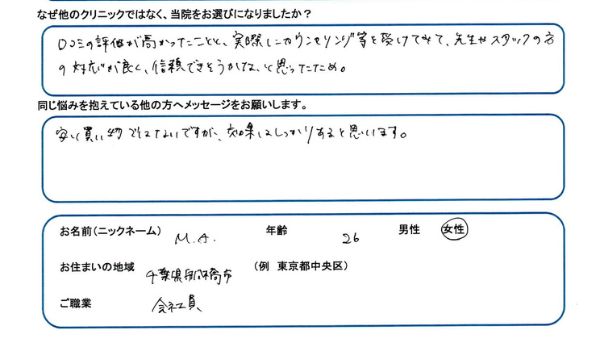 - 気持ちが楽になった。悩みがなくなって、ブーツの試着が楽しくなりました。【S.S 40 女性 千葉県 会社員】