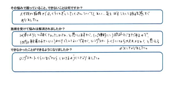 細くなった、気にならなくなった、足出せた、嬉しかった、抵抗なくなった、理想の形